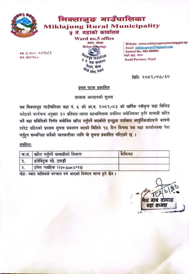 प्रस्ताव आव्हान को सूचना। वडा नं ५
