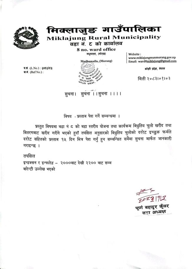 » प्रस्ताव पेश गर्ने सूचना। मिक्लाजुङ गाउँपालिका ८ नं वडा कार्यालय मोरङ