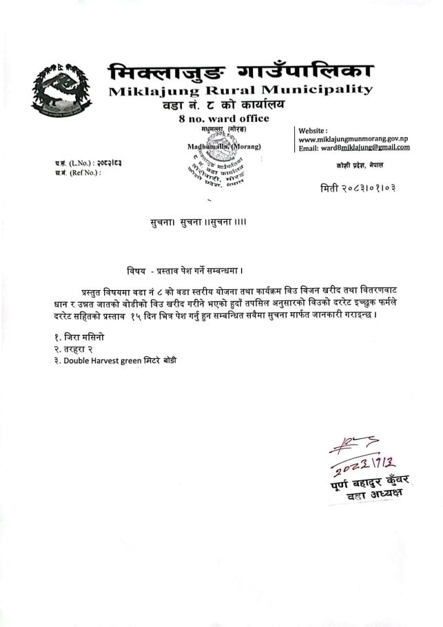 प्रस्ताव पेश गर्ने सूचना। मिक्लाजुङ गाउँपालिका ८ नं वडा कार्यालय मोरङ