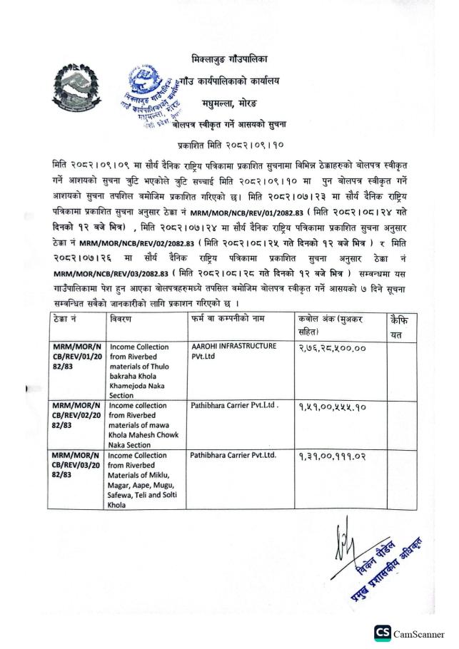 बोलपत्र स्वीकृत गर्ने आशयको सूचना।