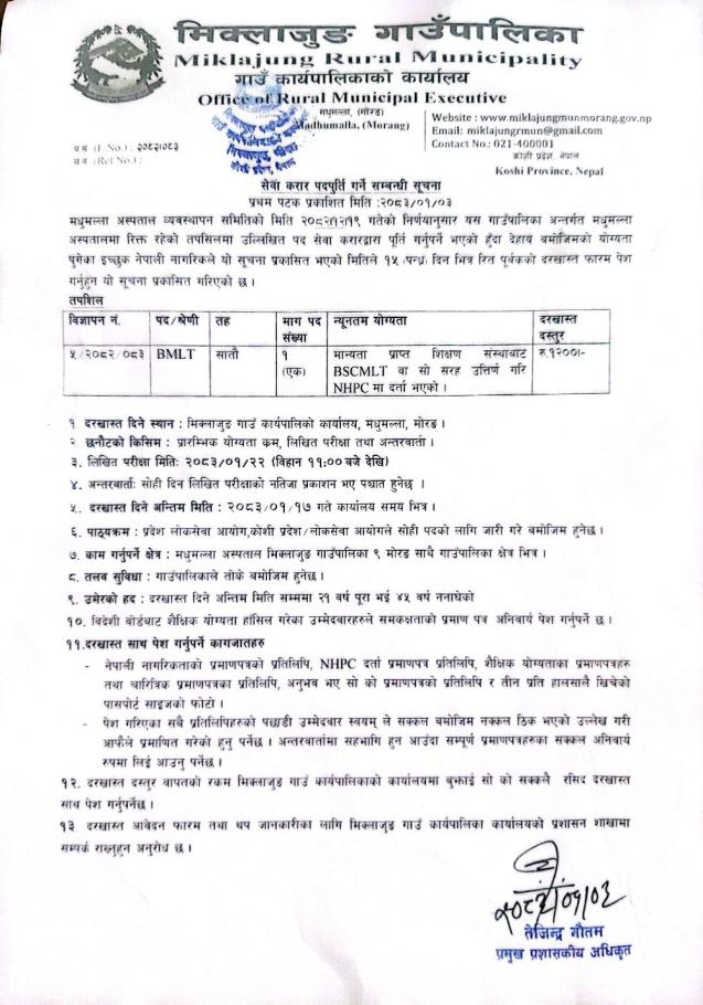 » सेवा करार पदपुर्ती गर्ने सम्बन्धमा। बि एम एल टी मधुमल्ला अस्पताल