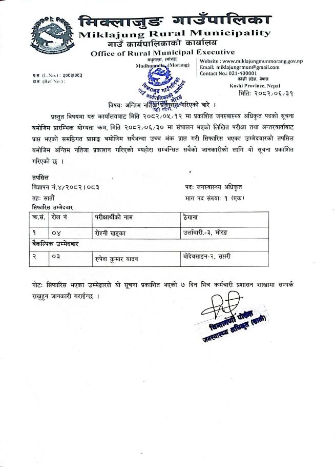 अन्तिम नतिजा प्रकाशन सम्बन्धी सूचना।