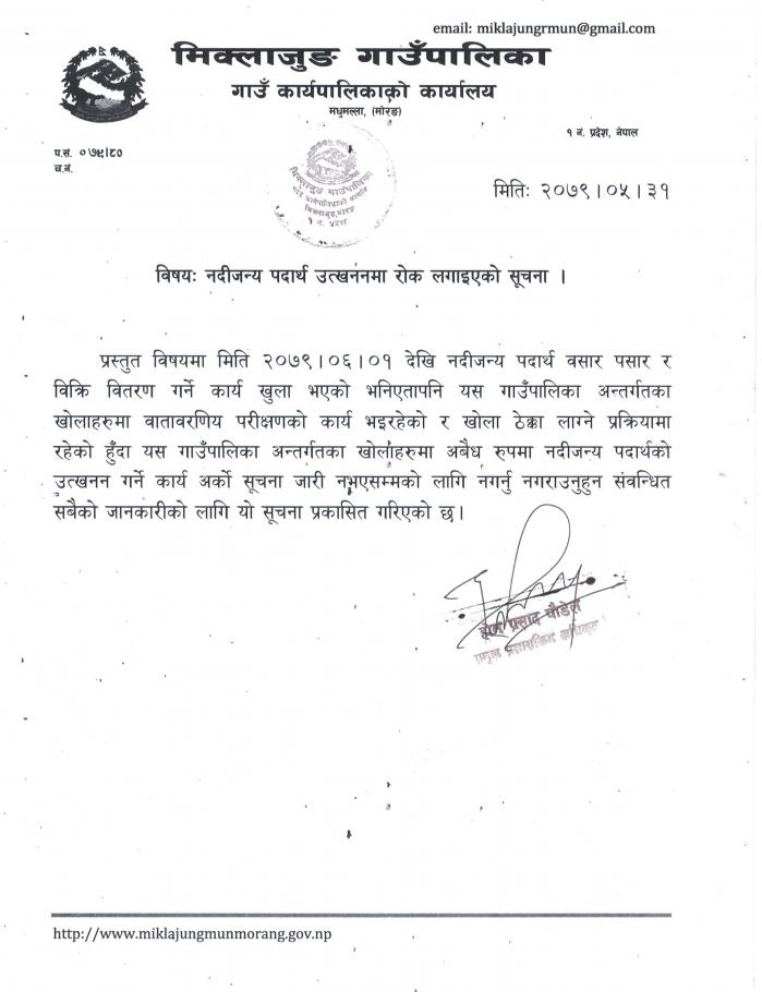 नदिजन्य पदार्थ उत्खननमा रोक लगाइएको सम्बन्धि सूचना