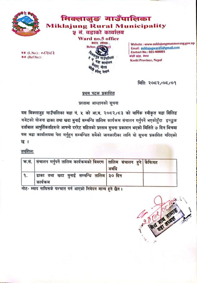 » प्रश्ताव आव्हान सम्बन्धी सूचना। वडा नं ५
