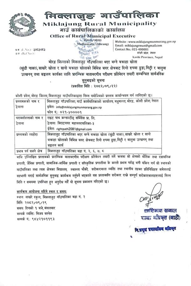 मिक्लाजुङ गाँउपालिका भएर बग्ने बक्राहा खोला (खुंडी नाका), साखरे खोला र सानो बक्राहा खोलाको विभिन्न बगर क्षेत्रबाट ढुङ्गा, गिट्टी र बालुवा उत्खनन् तथा सङ्कलन कार्यका लागि प्रारम्भिक वातावरणीय परीक्षण प्रतिवेदन तयारी सम्बन्धित सार्वजनिक सूचना।